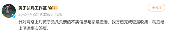 2月15日0點(diǎn)25分,黃子弘凡工作室轉(zhuǎn)發(fā)一則律師聲明并配文: