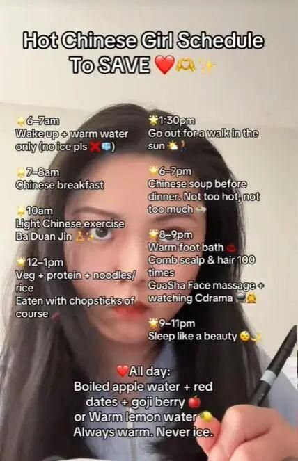還有人列出了更詳細的版本,在《八方來財》的背景音樂里,還原中式生活的一天,方便大家抄作業(yè),包括但不限于早起喝熱水(加枸杞)、自己做溫?zé)岬脑绮汀⒋虬硕五\、曬太陽散步、泡腳……