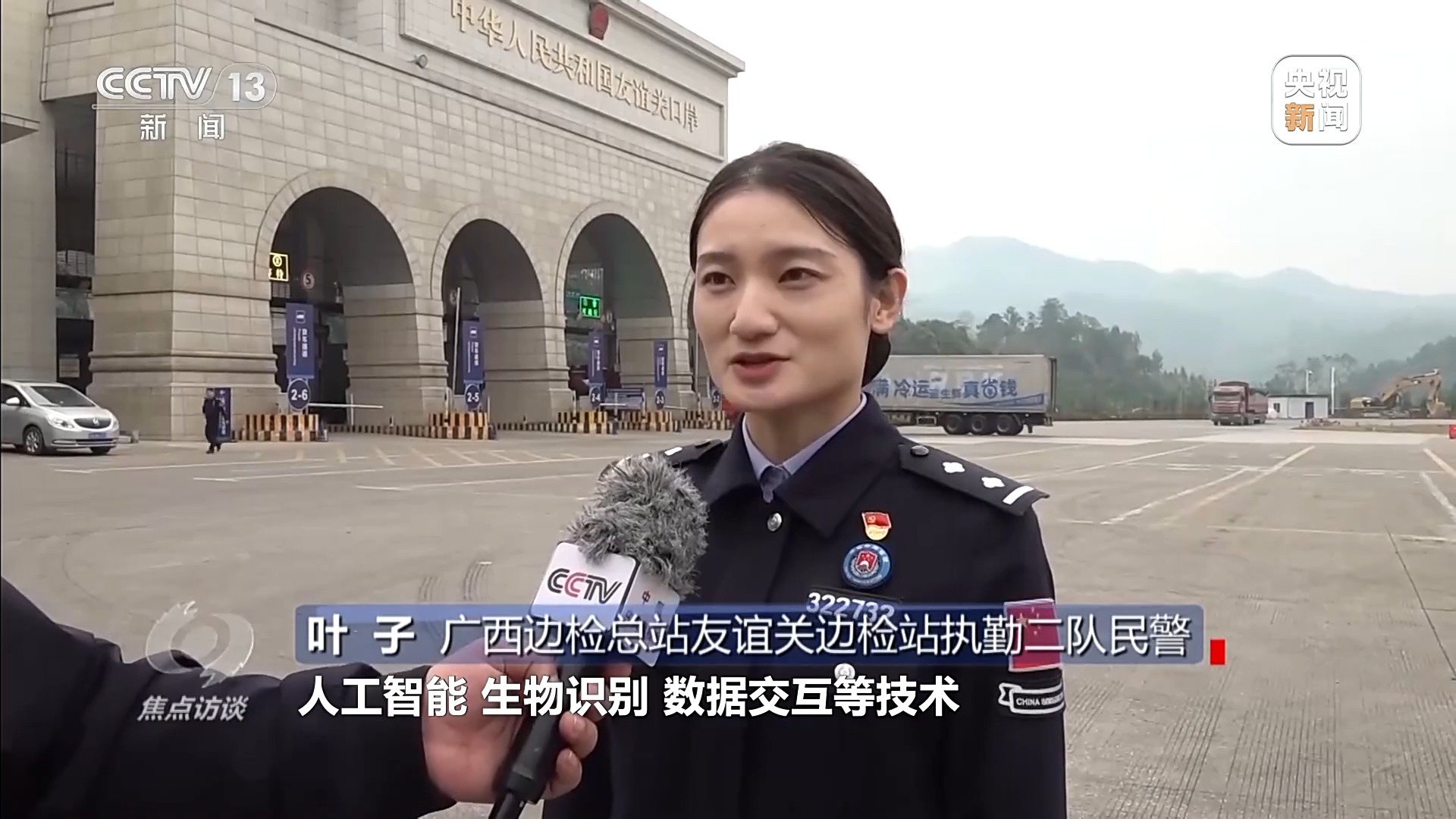 廣西邊檢總站友誼關邊檢站執勤二隊民警 葉子:我們整合了人工智能、生物識別、數據交互等技術,實現車輛和司機預先備案、自主采集、快速核驗三步即可通關,讓數據先跑、貨車秒過成為現實。